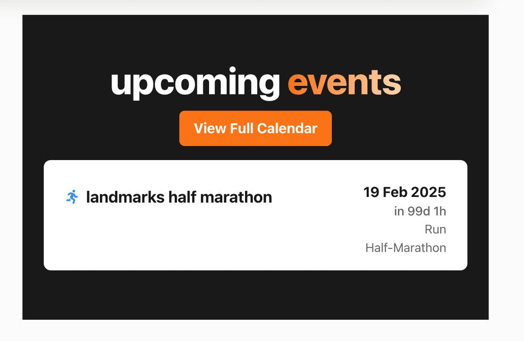 Display your upcoming races and goals. Stay motivated, track what's next, and let others follow your journey.